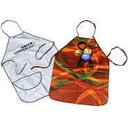 Avental em brim ou algodão metalizado, acabamento em costura ou viés colorido.